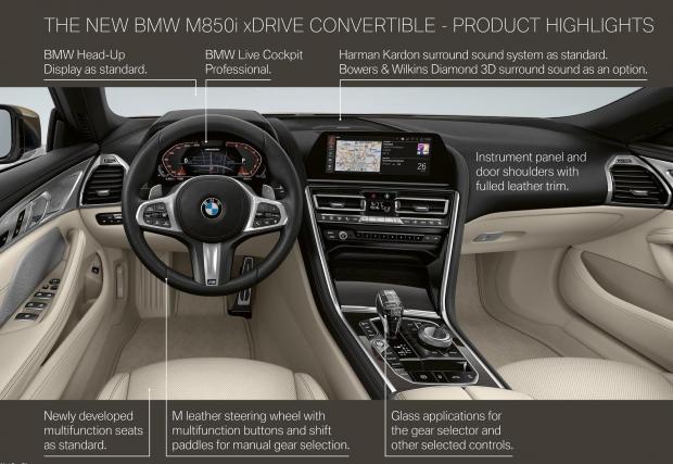 Двигателите? Един бензинов и един дизелов, същите мотори, с които излезе и купето. M850i се задвижва от 4,4-литровия битурбо V8 агрегат с 530 к.с. между 5500 и 6000 об/мин, както и 750 Нм в диапазона 1800-4600 об/мин. Ускорението от 0-100 км/ч става за 3,9 секунди, а максималната скорост е ограничена на 250 км/ч.
