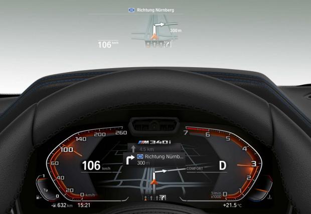 На пътя лесно ще различавате M340i по новите бъбреци и елементите на решетката и многото детайли от отдел М. Особено готино е новото табло - обърнете внимание на скоростомера и оборотомера.