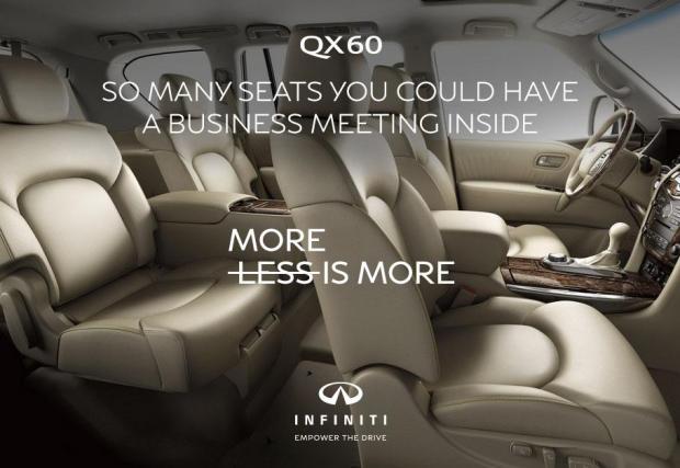 Комуникационната кампания “More is more” на Infiniti QX60 спечели злато на престижния международен конкурс за дигитален маркетинг IAB MIXX AWARDS 2018. В петък вечерта на официална церемония в Sofia Event Centre проектът беше отличен с награда за най-добра кампания в категория „Effective use of data”. “More is more” е част от маркетинговата стратегия на бранда за представяне и налагане на луксозния 7-местен SUV Infiniti QX60 и се изпълнява от рекламна агенция Proof. Основната идея в кампанията е, че клиентите, които купуват автомобили в този сегмент, предпочитат да получават максималното за парите си – повече сигурност, повече комфорт, повече лукс, повече опции за подпомагане на шофирането и паркирането, повече пространство, повече динамика на шофиране, повече забавление, повече ефективност. Всички тези желания се събират в един модел – QX60. Кампанията е насочена към бизнес клиенти с цел заявки за тест драйв в най-голямата платформа за бизнес контакти LinkedIn. Сегментирането и таргетирането се подпомага от официалния партньор на LinkedIn у нас Httpool.