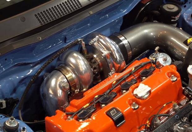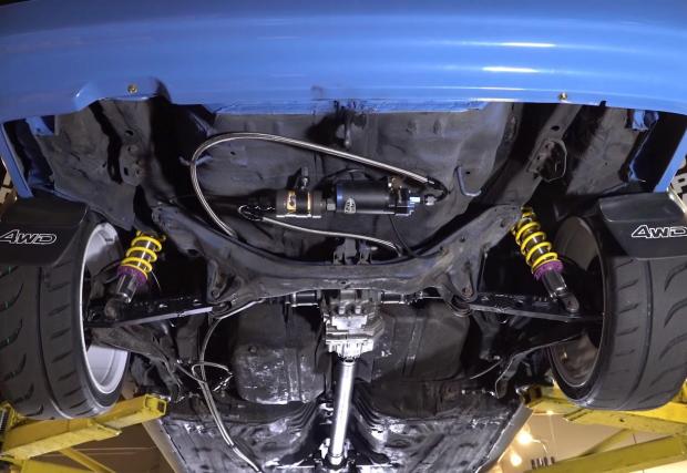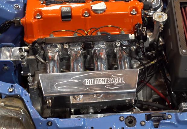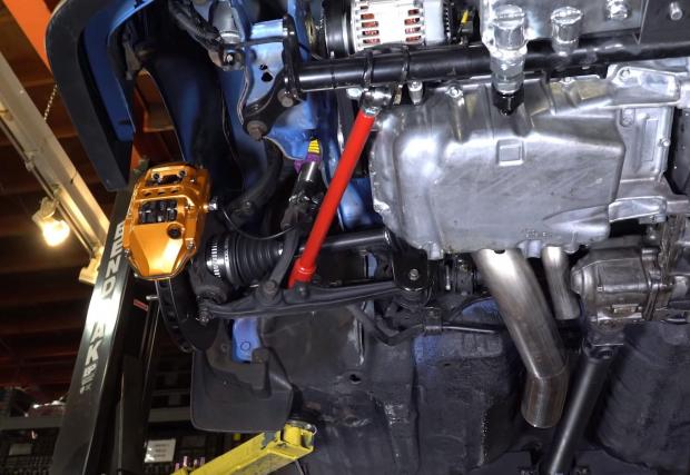 Двойното задвижване пък се осигурява от раздатъчна кутия 2014 CR-V и изработен по поръчка кардан, свързан с 2004 CR-V диференциал отзад. Друго? Има още доста, като например масивните спирачки BuddyClub, окачването KW V3… Най-добре гледайте видеото.