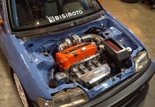 Двигателят е „хибрид“ – блокът е K24Z7 от 2014 Honda Civic, а главата е от K24Z3. Турбината е 72-милиметрова от Turbonetics, по мотора има още доста части, които няма да споменаваме, а скоростната кутия е секвенциална Quaife. Мощността? Биси казва, че в момента разработва агрегата на около 770 коня, като настройките ще позволят постигането над 1000.