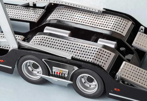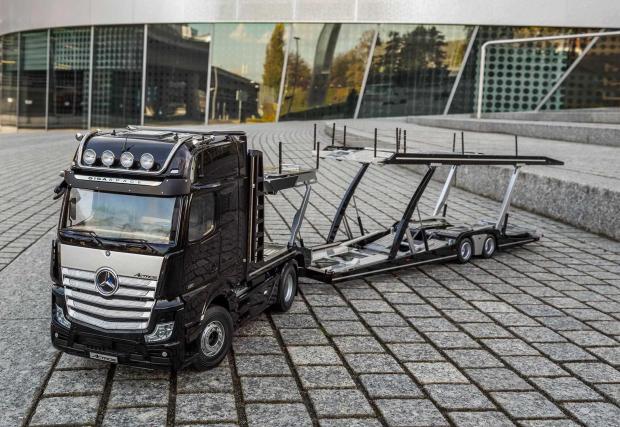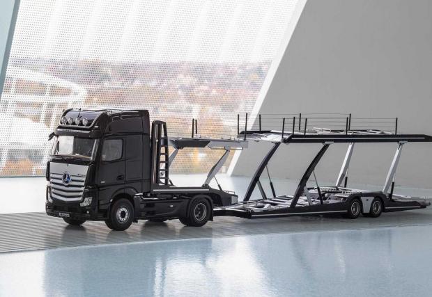 Когато колекцията ви от моделчета Mercedes набъбне, съвсем логично изниква въпросът как най-ефектно бихте могли да ги изложите. Решението идва от самия Mercedes-Benz, който вече предлага влекача с ремарке с автомобилни платформи Actros Gigaspace в мащаб 1:18. Гигантската “играчка” е с дължина 113 см и тежи 10 кг.