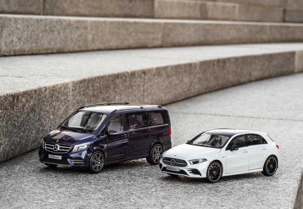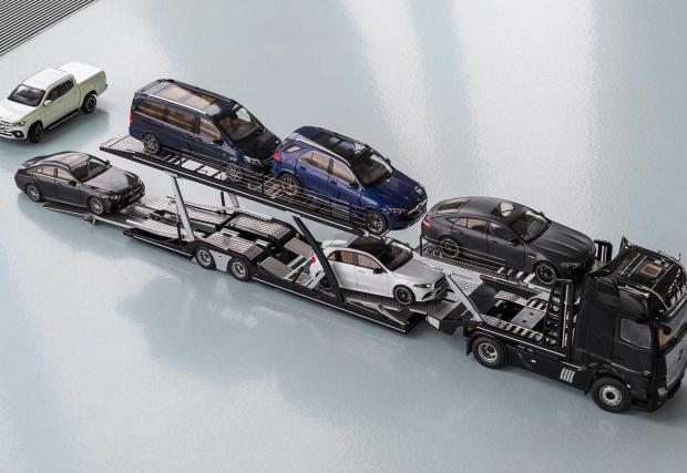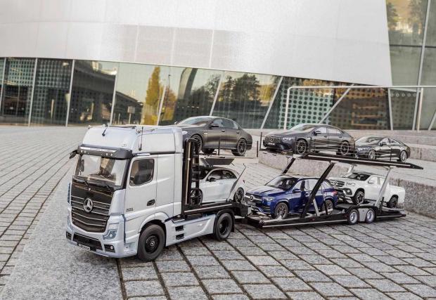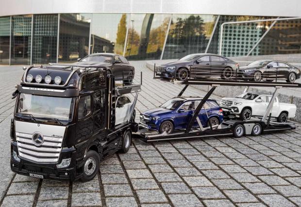 В случай че едва сега започвате своята колекция в мащаб 1:18, Mercedes предлага шест модела, които отлично биха допълнили празните места в товарната платформа на Actros - може да избирате между А-клас, V-клас, X-клас, GLE, E63 S и AMG GT63 Coupe като цените са от 80 до 120 евро.