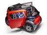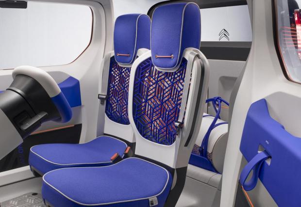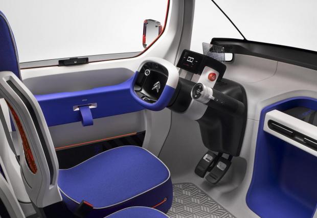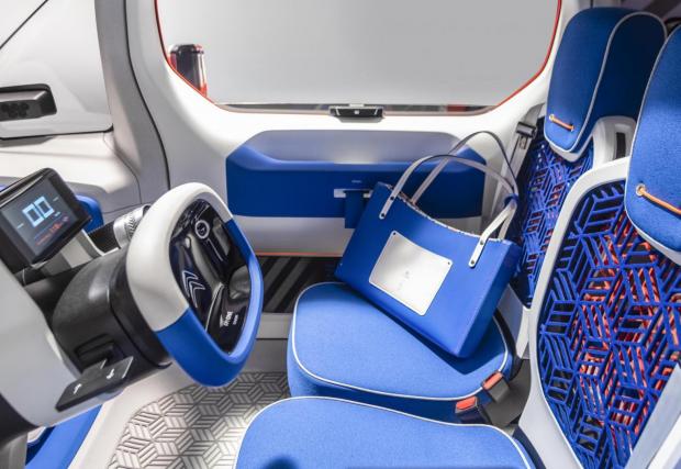 Липсата на преден капак означава, че мястото за багаж се намира не само зад гърбовете на пътниците, но и в краката на спътника на шофьора. Покривът пък е просто парче плат, а седалките приличат на градински столове, само че са изработени на 3D принтер.
