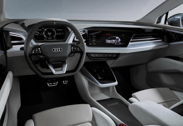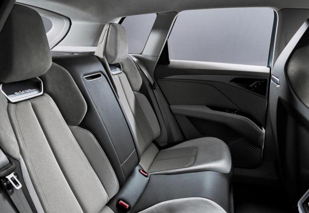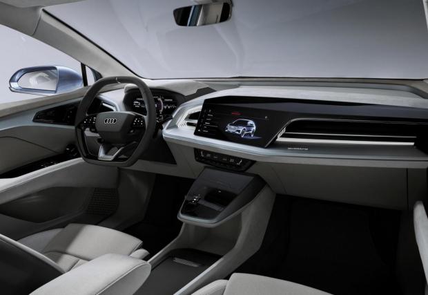 В интериора има четири места (в серийната версия ще са пет), а скъпата кожа е отстъпила място на тапицерия от рециклирани материали, за да бъде Q4 e-tron съвсем еко.