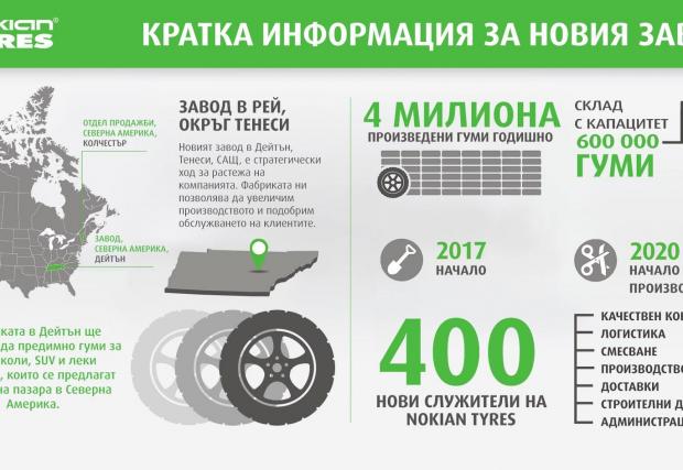 Фабриката е на стойност 360 милиона долара и разположена е на над 77,000 квадратни метра площ (830,000 квадратни фута). Тя ще обслужва клиенти в САЩ и Канада и с този проект Nokian Tyres искат още по-упорито да отстояват своя ангажимент за безопасни и устойчиви продукти и процеси. Към момента приблизително 200 работника са на строителната площадка и всеки ден работят по изграждането на първата северноамериканска фабрика на компанията.