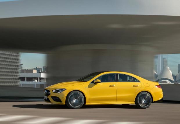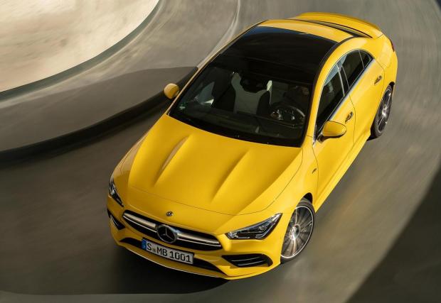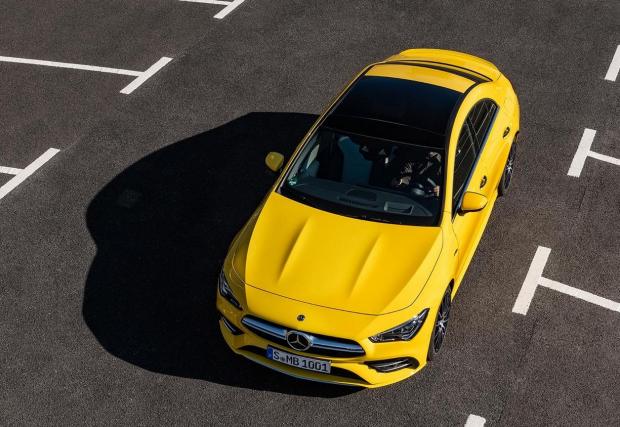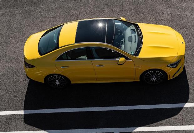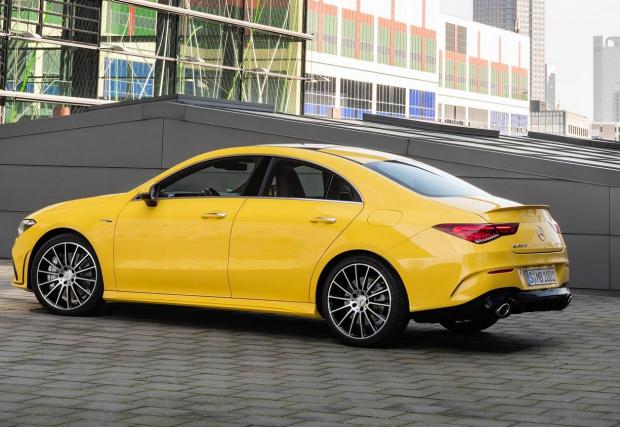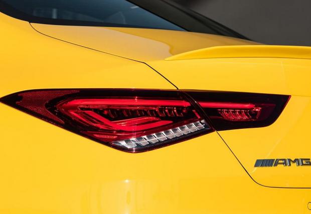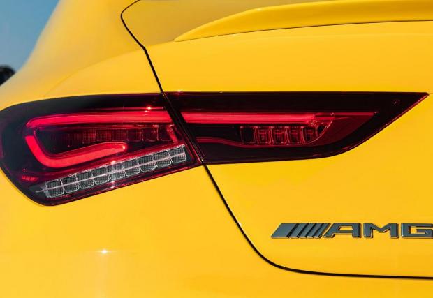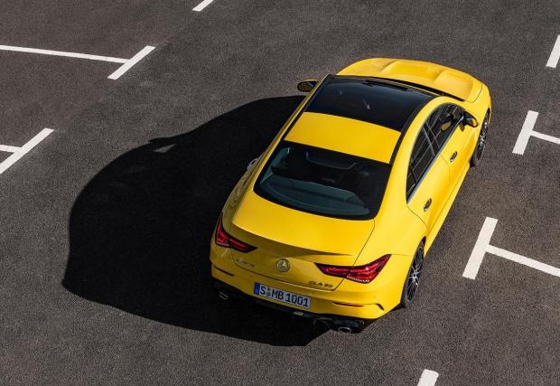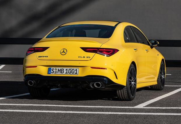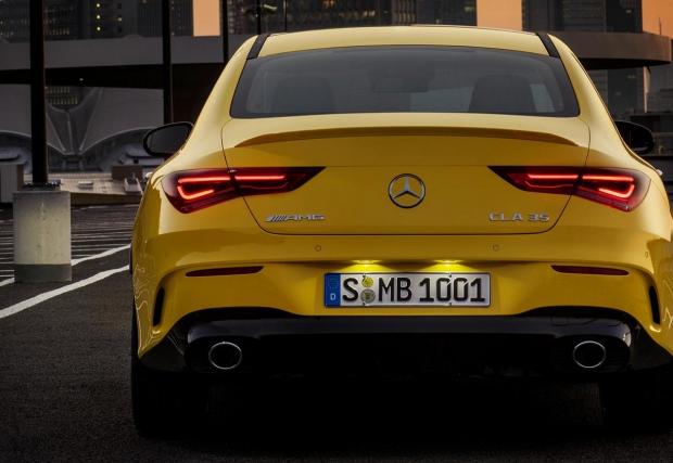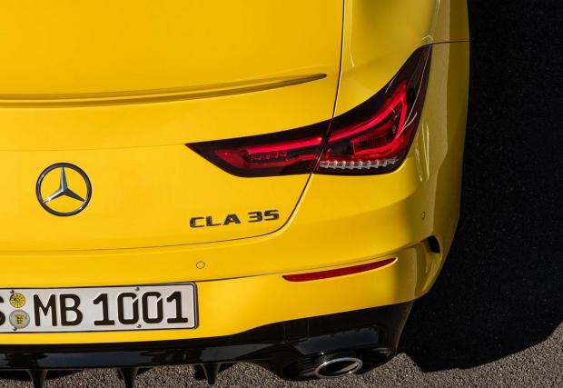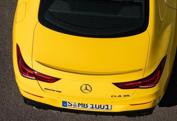 Визията също е любопитна. Mercedes засега показва само жълт екземпляр от спортния седан и цветът определено ни допада много. В сравнение с обикновен CLA, AMG 35 вариантът идва с допълнителен лип за предната броня, по-изразителен дифузер отзад и два големи кръгли накрайника на изпускателната система. Стандартното оборудване включва 18-цолови колела, но можете да доплатите и за 19-ки.