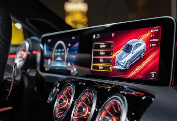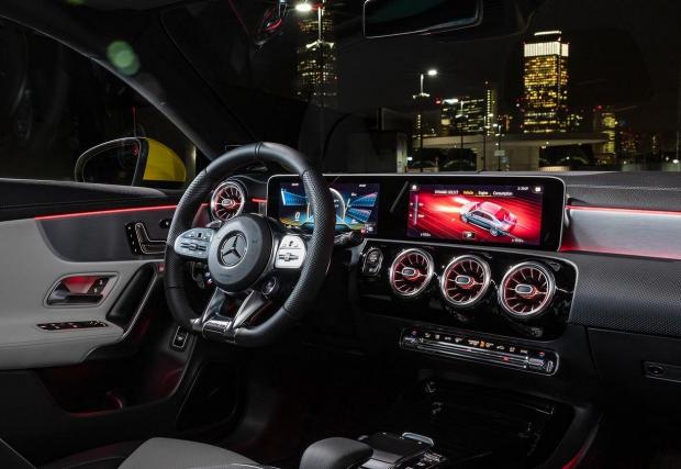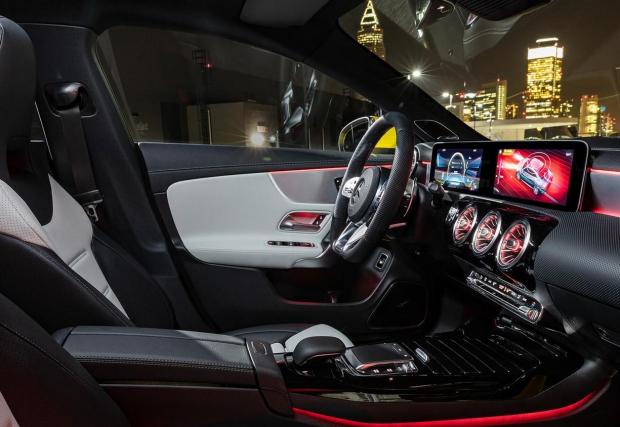 Интериорът не е изненада, виждали сме двата големи 10.25-инчови екрана и в другите базирани на A-Class модели, но тук откриваме и готини спортни седалки. Към това марката добавя и амбиентно диодно осветление с 64 (!) цвята, както и специални режими на инфотейнмънт системата - Classic, Sport и Supersport.