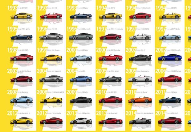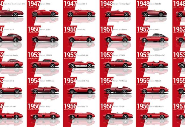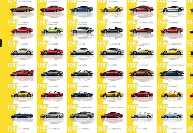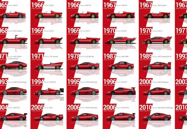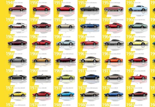 Видеото, на което попаднахме, показва всяко едно Ferrari, произведено в славната история на марката. Компютърните рендъри са доста детайлни и по забележителен начин показват еволюцията на “Черните кончета”: от следвоенните години, когато всички коли изглеждат еднакво заоблени, до характерния дизайн, който Ferrari си извоюва през 80-те и 90-те. Липсват единствено болидите от Формула 1. Всичко друго е тук. От 166 Inter - първият шосеен GT модел на компанията, създаден през 1948, до униката SP38, роден преди броени месеци...