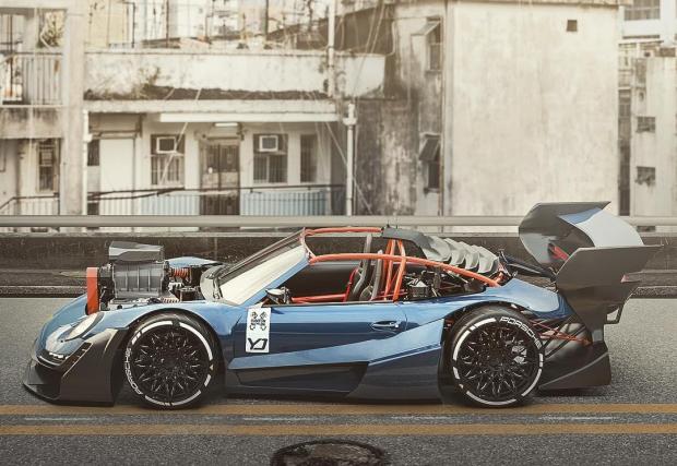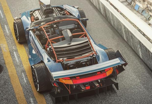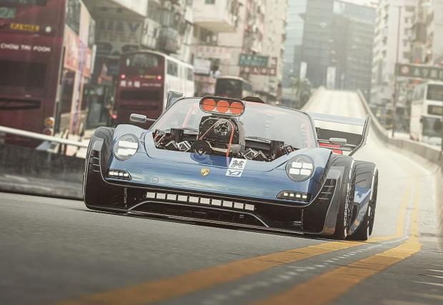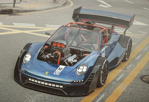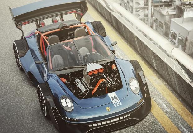 Макар и идеята да махнеш боксерния „шестак“ от 911 в полза на V8 „мъсъл“ да ни звучи меко казано екстравагантнo, то дигиталните рисунки ни вдъхват надеждата, че ще видим уникален открит автомобил. Само обърнете внимание на арките на калниците и тяхното продължение от двете страни на автомобила, както и на огромното антикрило отзад. А, да не забравим и бруталната тръбна клетка за кокпита.
