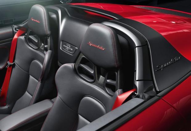 Лого „Speedster“ украсява подглавниците и видимите прагове на вратите от карбонови влакна, както и централния оборотомер. Както другите инструменти, той има черни циферблати с бели стрелки, както и зелени цифри и скали - характеристики, напомнящи за известния му предшественик Porsche 356 Speedster. Емблема за лимитирана серия на напречната конструкция зад предните седалки показва серийния номер на 911 Speedster, който е ограничен само до 1 948 броя.
