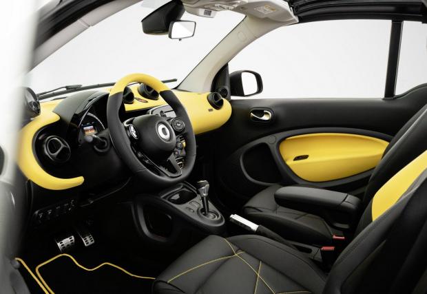 Черно-жълтото решение е запазено и в интериора, макар и без смахнатото преливане. Последният бензинов Smart ще излезе от завода през август и оттам нататък всички версии на Smart ще се задвижват единствено от батерии и електромотори.