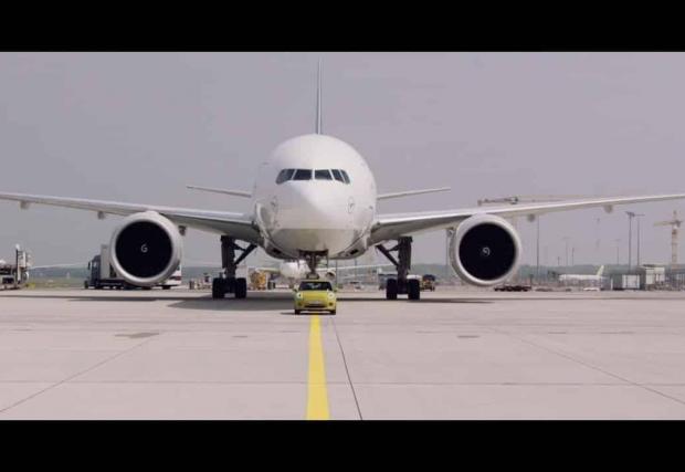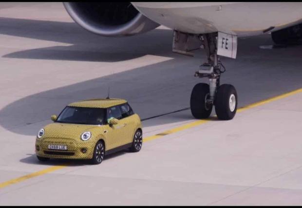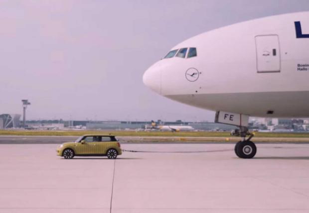 Малкото електрическо MINI явно не се страхува да влезе в ролята на влекач за гигантския самолет. Разбира се, в промоционално видео може да се случи всичко… Не че подценяваме възможностите на мъника...
