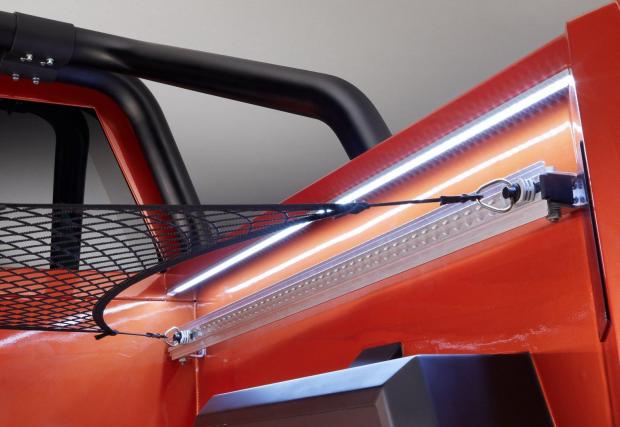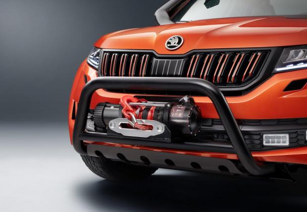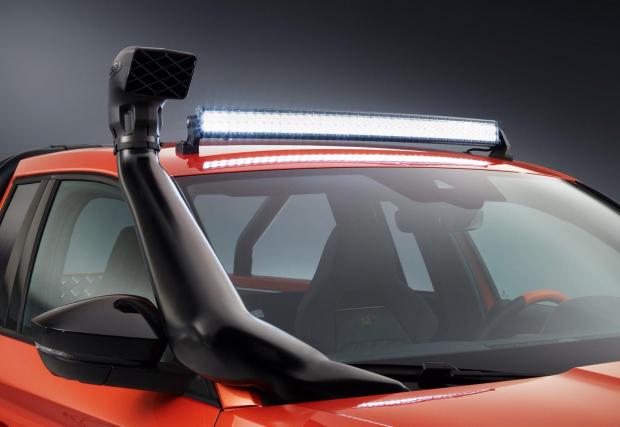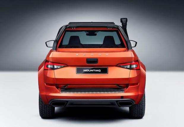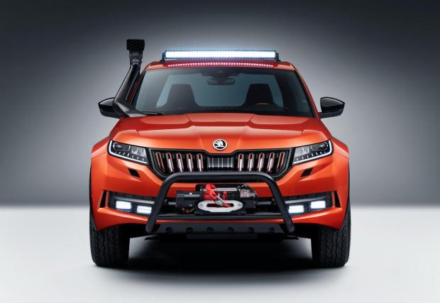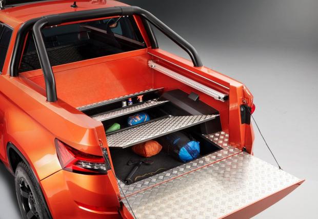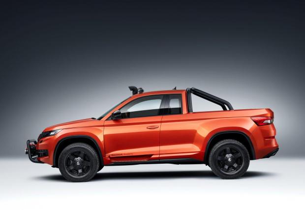За основа е използван Kodiaq Scout, но, както ще забележите, пикапът е оборудван с по-голям просвет (общо 290 мм), шнорхел за газене в дълбоки води и офроуд светлини на покрива.