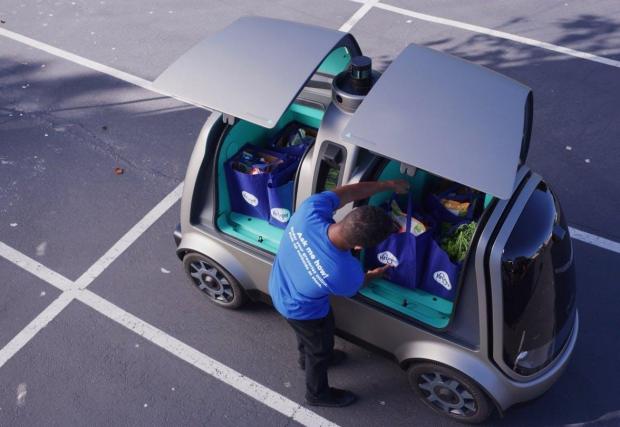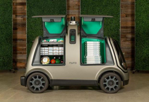 Количката на снимките се казва Nuro R1 и е напълно автономна. Тя не вози хора, а продукти, защото от Nuro смятат, че е по-лесно да повериш пицата си на автономно превозно средство, отколкото детето си. Има логика. Преди няколко месеца Nuro започна доставки на различни хранителни продукти в Скотсдейл, Аризона и Хюстън, Тексас, а сега и гигантът в доставките Domino’s влиза в играта и ще доставя своите пици пилотно с автономната количка.