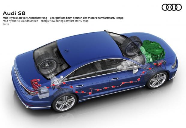 Казват обаче, че колата е снабдена с 48-волтов алтернатор, превръщат S8 в „мек хибрид“. Системата намалява разхода на гориво с до 0,8 л/100 км, което е важно. Както и ускорението от 0-100, което е…, а, да. Те си знаят.