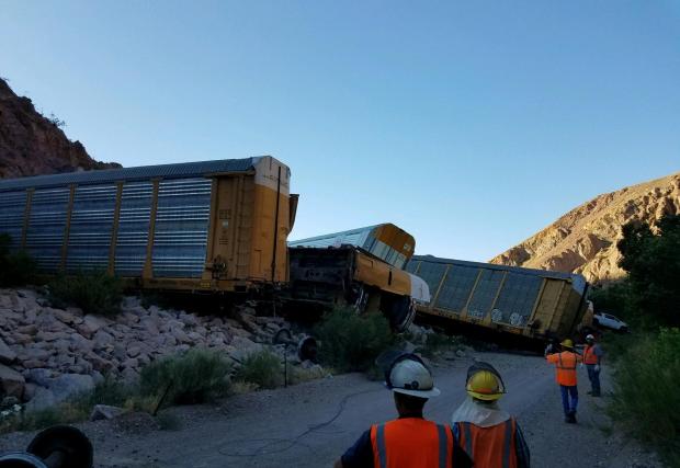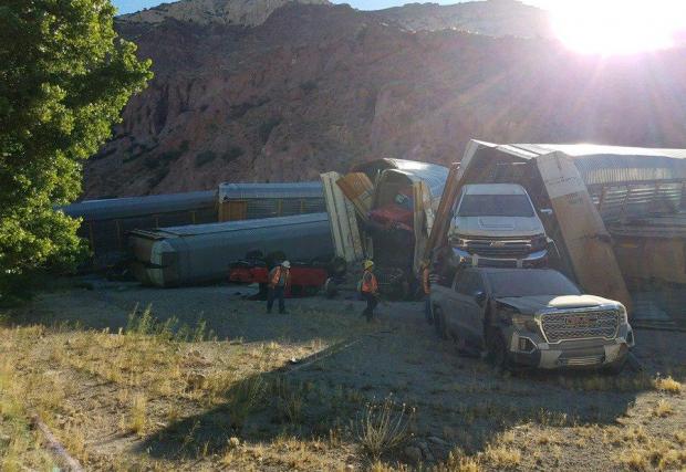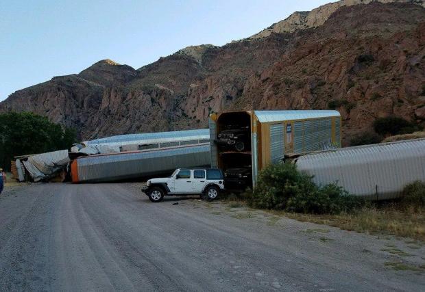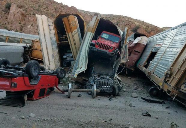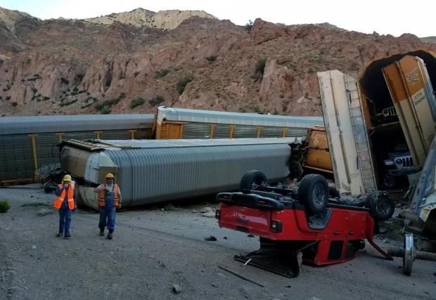 Влак със стотици чисто нови коли на Jeep, GMC и Chevy дерайлира