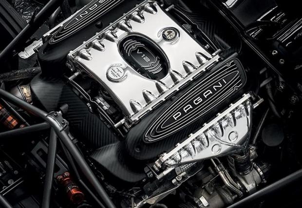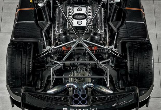 Карбоновият сешоар тежи едва 1217 кг, което е адски плашещо, като имате предвид задвижването от 6-литровия V12 на AMG. Мощността на свръх скъпото бижу е 800 к.с., въртящият момент към задните колела - 1050 Нм. Тази тяга стига до тънките ленти каучук, намазани по задните джанти (Pirelli PZero Trofeo R, разработени специално за Pagani), през 7-степенна кутия Xtrac. Избрана е система с един съединител, вместо с два, защото въпросната скоростна кутия е по-лека с 35%.