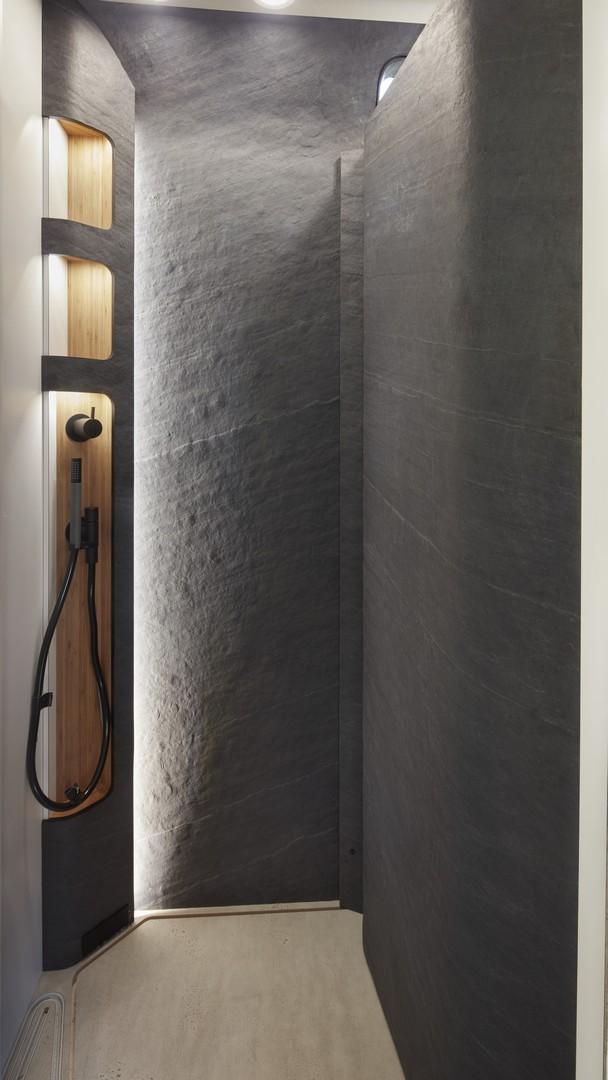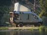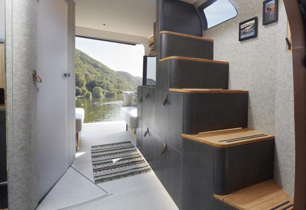 Но не там е голямата изненада. Кемперът всъщност е двуетажен и в действителност разполага с вътрешно стълбище, подобно на това е мезонетите. На първия етаж откриваме нещо като всекидневна с малък кухненски бокс, а малко пространство е оставено и за баня. На втория етаж е разгъваемата спалня, която има и разтегаема тераса за по-добър изглед към природата, когато сте на диво къмпингуване. Въпреки внушителните си размери, кемперът предлага място за двама.