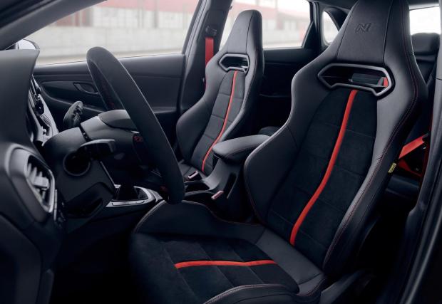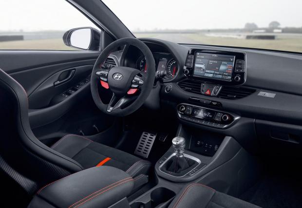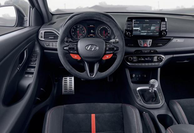 Окачването също е пипнато, хотхечът е спуснат с 6 мм към асфалта, а центърът на тежестта е с 8,8 мм надолу, казват корейците. Що се отнася до мотора, той е познатият 2-литров турбо бензинов, в по-мощното от двете изпълнения: 275 к.с. и 378 Нм. Скоростната кутия е 6-степенна механична, с готина метална топка, а ускорението от 0-100 е… неизвестно. Знаем обаче, че Performance версията на тежащия малко над 1,5 тона сериен i30 N вдига 100 за 6,1 секунди, така че тук можем да очакваме време около 6. Максималната скорост е ограничена на 250 км/ч.