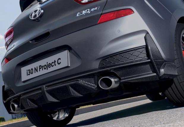 Въпросната лекота е „добавена” чрез използването на карбон (армирана с въглеродни влакна пластмаса - CFRP) за предния капак, което сваля 7,2 кг от масата на колата. Спортните седалки Sabelt също са с карбонова основа и ръчни настройки, вадейки още 7,5 кг от уравнението за обща маса, като почти половината от 50-те килограма надолу, се дължат на подмяната на джантите. Hyundai i30 N Project C търкаля 19-инчови ковани OZ-ки, тежащи общо с 22 кг по-малко от стандартните колела на i30 N. Друго? Има още карбон по праговете и дифузьора отзад.