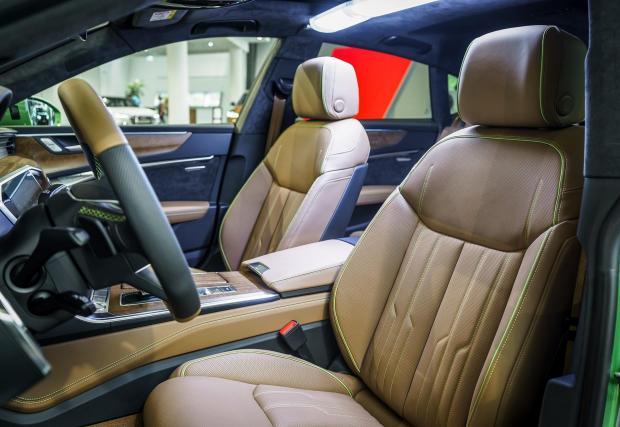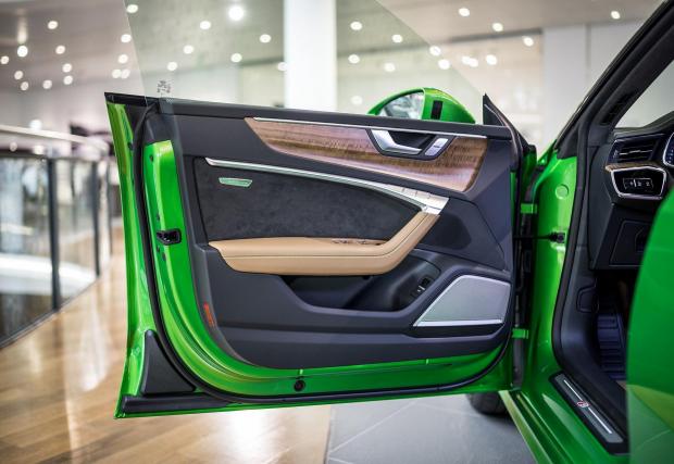 Същият цвят, макар и в хомеопатични количества, се появява и в интериора. Кабината е облицована в материали от каталога на Audi Exclusive – светла кожа с контрастни зелени шевове, както и алкантара за корите на вратите, тавана и колонките. Има и малко дървени декорации, които принципно бихме пропуснали.