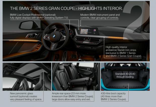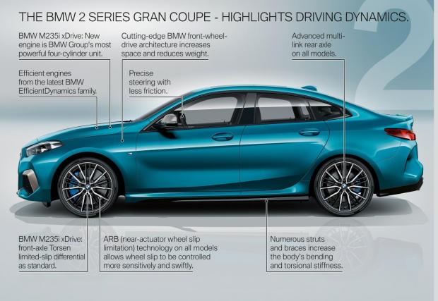 Естествено, както стана дума, малкият стилен седан се базира на платформата на BMW с предно предаване. Двигателите са ни добре познати от другите компактни модели на фирмата, като гамата включва един дизелов и два бензинови модела при старта на продажбите в Европа. По-точно, от трицилиндров мотор със 140 к.с. при 218i, през четирицилиндров дизел 190 к.с. при 220d до най-мощния четирицилиндров двигател на бранда 306 к.с. във версия M235i xDrive. Само за САЩ остава опцията 228i xDrive с 231 к.с.