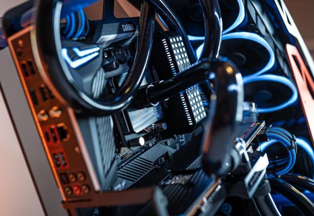 Използвана е кутия Cougar Conque Case (намерихме я за 500 лв.), после Robeytech добавя 8-ядрен процесор AMD Ryzen 7 3800X (около 850 лв.), дънна платка MSI MPG X570 Gaming PRO Carbon WiFi ATX AM4 (около 850 лв.) и памет Corsair Dominator Platinum RGB RRD4-3200 (около 530 лв.)