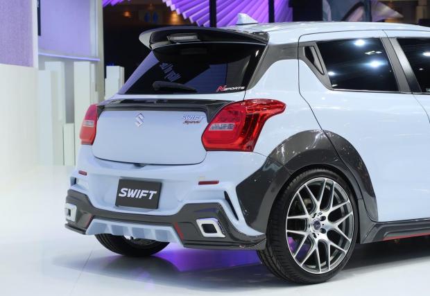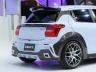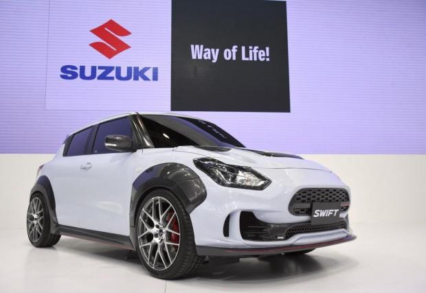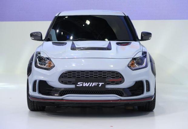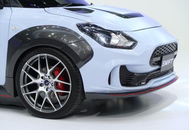Външността е смело прекроена с черни детайли, отличителни отвори за охлаждане и нов сплитер. Нископрофилните гуми, допълнителният спойлер и дифузьора в цвета на купето подсказват, че Swift се е сдобил с нов много по-сериозен двигател. За съжаление точно по тази тема Suzuki не разкрива абсолютно нищо. Според нас обаче сериозно турбинирана версия на 1,4-литровия мотор може да доближи 200 к.с. без никакъв проблем. А това би превърнало 970-килограмовия мъник от Япония в джобна ракета.