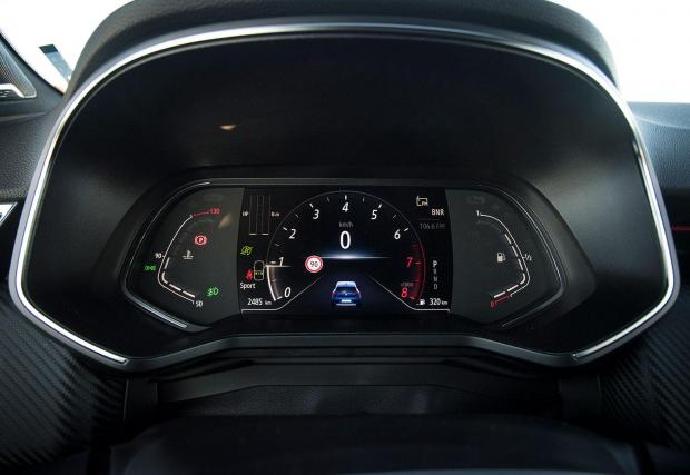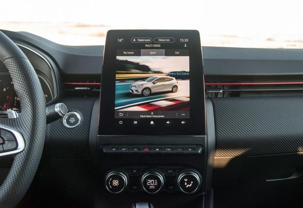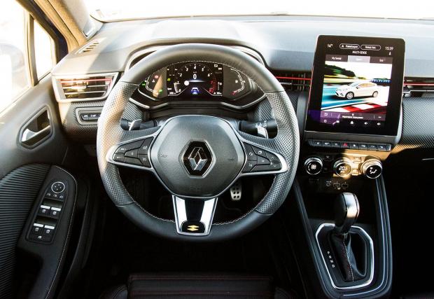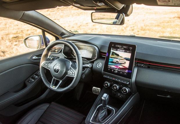 При него също има осезам скок на качеството на материалите, като и тук виждаме меки карбоноподобни повърхности, подобни на тези в 208. Първото впечатление, сядайки зад волана на Clio, е че тук няма толкова радикални промени във формите на таблото. Инструменталният панел е частично дигитален – 4,2-инчов LCD в средата, с показатели на температурата и нивото на горивото от двете страни. Малко по-късно през годината Renault ще предложат и напълно „виртуален“ панел, макар и не толкова „космически“, като този на 208. Централният дисплей пък може да е в три размера: серийният за базовото ниво е монохроматичен и заобиколен от физически бутони или 7-инчов тъч от второто ниво Zen нагоре (Life, Zen, Intense, R.S. Line). Най-големият 9,3-инчов, който имаме в нашия тестови автомобил, се доплаща 790 лв. или 1440 лв., ако е с навигация и система от камери за 360-градусов обзор. В тестовата кола е в струващия 1290 лв. комплект със стерео Bose. Инфотейнмънт системата работи окей, графиките не са толкова остри, като при Peugeot, но менютата са малко по-логично подредени.