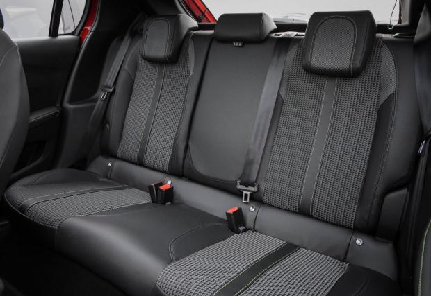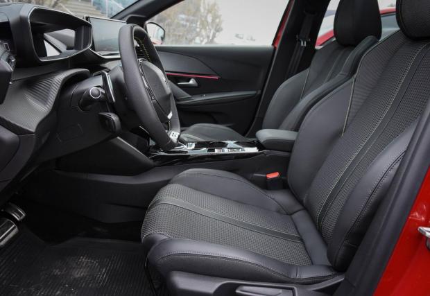Предните седалки са приятни, с добра странична опора, като кожата е серийна само за ел. версия е-208, а в нашата GT Line e доплатено 3500/4000 хил. лв. за кожа/текстил, в комплект с подгрев.