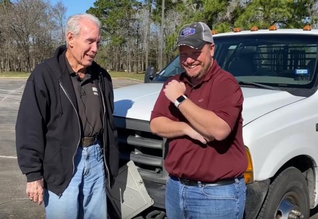 Бялата камионетка, която виждате във видеото, е модел Ford Super Duty от 2000 година. Собственост е на 80-годишния Джон Фрийленд от Тексас, който дълги години наред работи като шофьор на свободна практика - чака обаждания от компании и изпълнява различни курсове из Америка. Без ограничение в пробега и времето, през всички четири сезона.