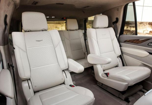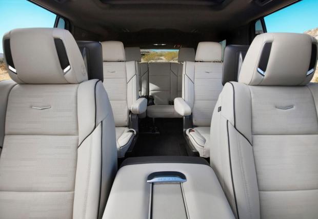 2021 Escalade е разточителен и отвътре: 40% повече място на 3-я ред седалки и, забележете, 68% по-голям багажник, чиито обем възлиза на 722 литра. Това е пространството, което остава зад третия ред седалки на стандартната версия, късата база... Багажникът при ESV е най-малко 1214 литра.