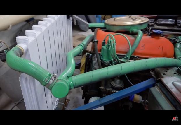 „Повече двигатели – повече охлаждане“, стара руска поговорка. Шегата настрана, тази „Двух моторная Жига“, както я определят „Гараж 54“, е напълно истинска. И, както виждате, проблемът с охлаждането е решен генерално, с монтирането на стандартен радиатор. Стандартен за монтаж в апартамент например...