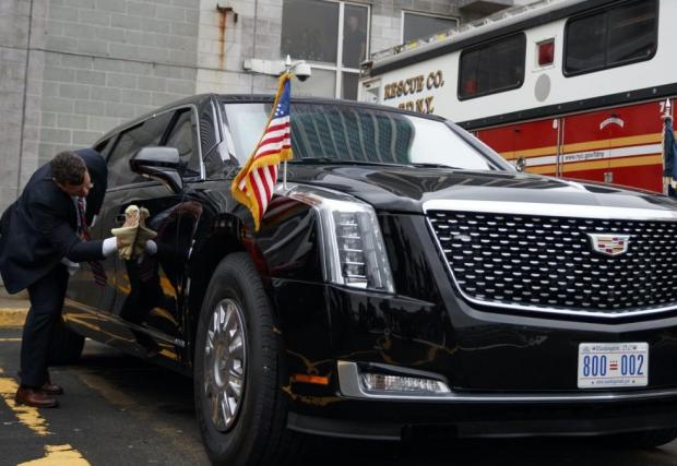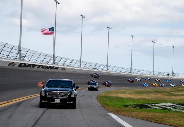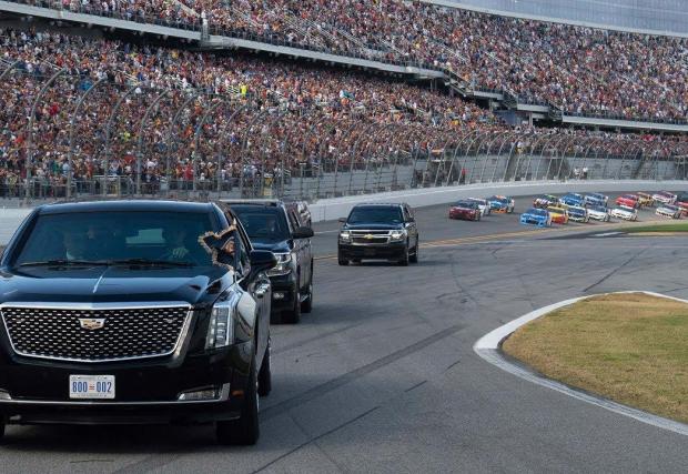 Носещата емблемата на Cadillac президентска лимузина изглежда доста нелепо в ролята си на водеща кола за колоната от състезателни машини. Бруталното чудовище тежи между 6000 и 9000 кг и стъпва на платформата на пикап Chevrolet. То е 7-местно и винаги на борда съдържа банки кръв от кръвната група на президента Тръмп. Стъклата са дебели 12,7 см, а бронировката във вратите достига 20 см. В случай на атака, колата може да защити пътниците си от всякакъв тип отровни газове, да разпръсне сълзотворен газ около себе си или масло на пътя на преследвачите.