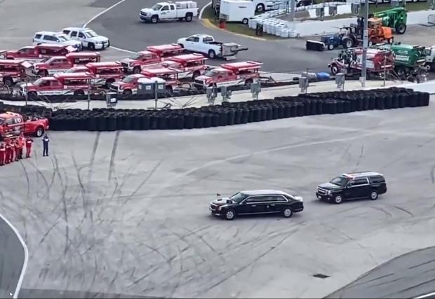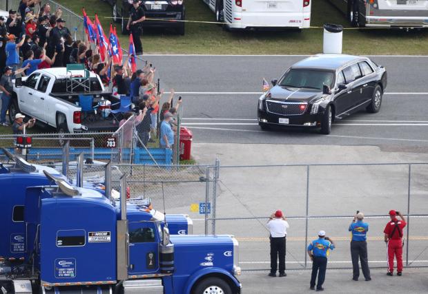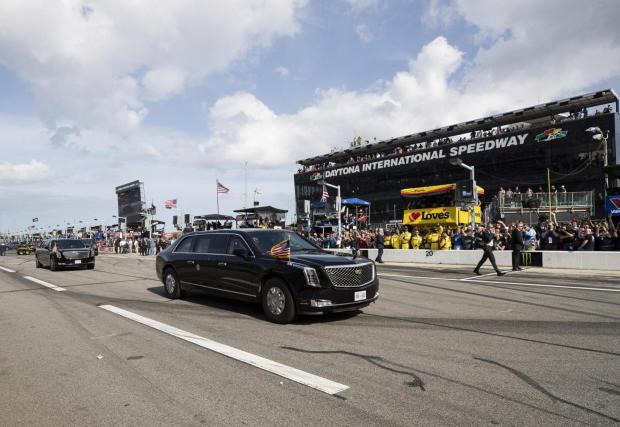 Не всеки ден може да видите подобна гледка. “Звярът” (The Beast), в който пътува американският президент Доналд Тръмп, завъртя обиколка на трасето на “Дайтона 500”. Овалът със 100 хиляди зрителски места определено не е най-подходящото място за “Сикрет Сървис”, но това не е попречило на Тръмп да се съгласи за обиколка по 4-километровото трасе.