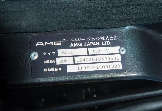 За конкретния екземпляр. Автомобилът е произведен през 1993-та, в модификацията 500 E, за която може да прочетете подробно малко по-надолу. Черен, ‘Blauschwartz’ металик (DB199), с черна кожа, класическа и много търсена комбинация. В някакъв момент колата е внесена в Япония, където AMG Japan извършват модификациите, за да я превърнат в 6.0 AMG, от които се говори, че съществуват не повече от 35 броя, в цял свят.