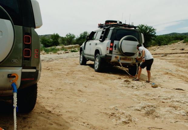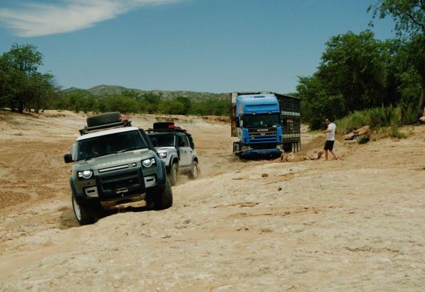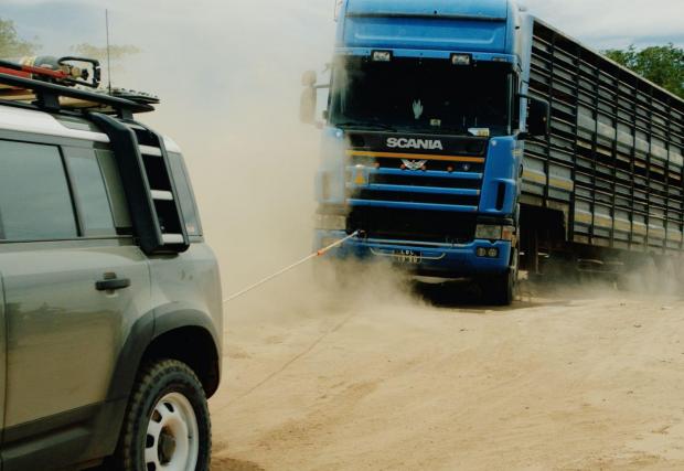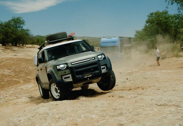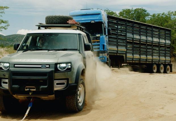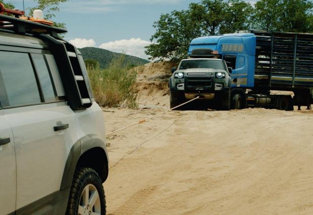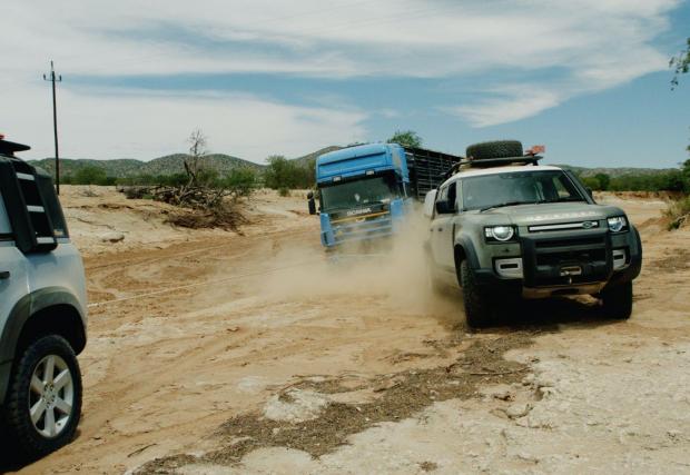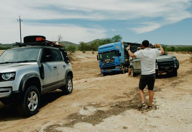 Първо предупреждаваме, че видеото е вероятно режисирано. Хората от Land Rover не го крият и признават, че са се възползвали да направят рекламно видео, когато случайно по време на тестове в Намибия попадат на закъсал влекач с полуремарке в сложна ситуация. Според хората от Land Rover шофьорът е бедствал от три дни в обезлюдено място без покритие на мобилните клетки, като вече е бил на привършване на храната и водата. Без да поставяме това под съмнение оценяваме качествените снимки и видео в не особено дружелюбните условия на пустинята Намиб. Така или иначе ситуацията - режисирана или не - е идеална за демонстрация на теглителните възможности на новия Defender.