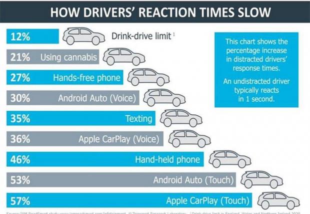 Според изследването средностатистически шофьор, който не се разсейва от нищо, реагира на опасност за около секунда. Когато е пил алкохол, но в границите на позволеното от закона (в България това е 0,5 промила), неговата реакция е с 12% по-бавна. Ако е използвал марихуана - с 21%, ако говори по телефона с hand-free - с 27%. Точните данни може да видите в графиката, като времето за реакция се увеличава с цели 53-57%, ако използва сензорния екран за функциите CarPlay и Auto.