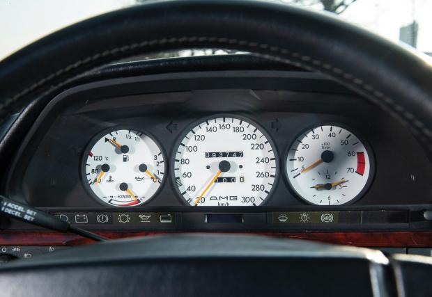 Вътре ще видите страхотните апликации от истинско дърво, както и белите циферблати. Централният е разграфен до 300 км/ч, а километражът показва пробег от 93 хил. км. Нищо работа, нито за шасито на W126, нито за този мотор.