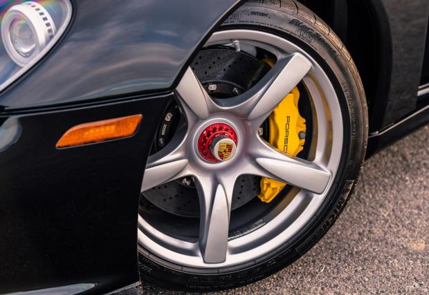 Как спира? Спира с 380-милиметрови карбо-керамични дискове (Porsche Carbon Ceramic Brakes). През 2001 г. Porsche представя първата кола с керамични спирачки в света, 911 GT2, като за 2003 усъвършенства системата, която спира маса от 1360 кг. Carrera GT е дълга 4,62 метра, широка е 1,92, а височината е едва 1,16 метра. Тя е любимият модел на Валтер Рьол, който знаете кой е. И който е участвал в разработката на колата.