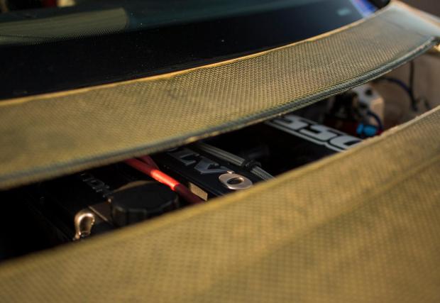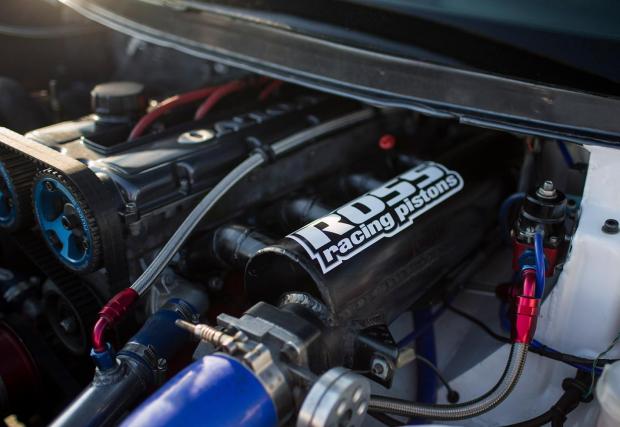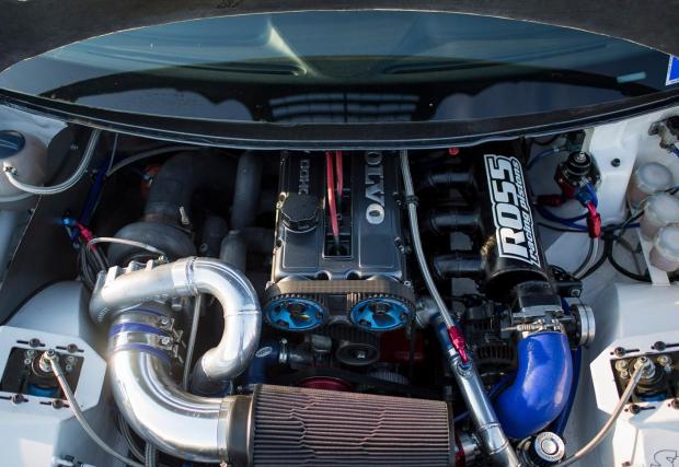 По-интересното обаче е под предния капак, заедно със свързаните с мотора назад части. Volvo агрегатът е 2,3-литровия 4-цилиндров B230FK, но на мястото на 8-клапановата SOCH глава, Матиас е завинтил 16V DOCH от B234F. Сменено е и почти всичко останало - ковано бутала Ross, Verdi ковани мотовилки, 1680-кубикови инжектори Bosch, захранвани от две помпи Bosch Motorsport 044. Турбината е Garrett GT4094R, а резултатът - 525 к.с. и 650 Нм при 6000 об/мин.