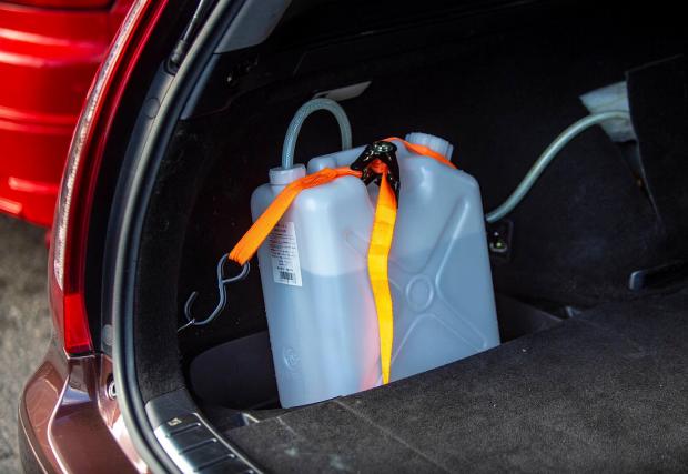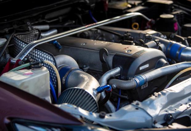 Blit излиза серийно с такъв, като този е със завинтена за него турбина Trust T78. Мощността? Не се споменава, но ако съдим по снимките колата/пилотът се справя добре. Обърнете внимание и на вързаната с ремък туба в багажника – това не е бензин или течност за чистачки, а вода за пръскалките на кулера.