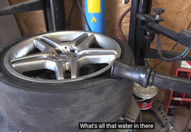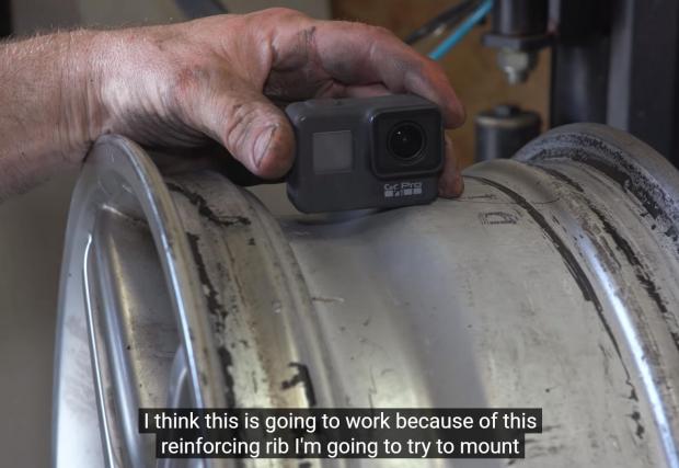 Сега WP изпълнява хрумване на зрител, което гласи следното: „Защо не залепиш едно GoPro вътре в автомобилна гума?“. Речено-сторено. Освен камерата, която е модел Hero 7 Black, изобретателят монтира също LED модул (иначе нямаше да има особен смисъл от камерата), както и допълнителна батерия за нея.