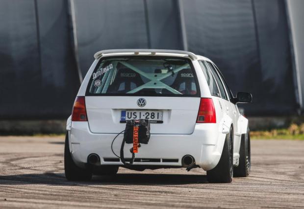 Които обаче не получили одобрението на 6-тепенната скоростна кутия, която бързо отишла в пенсия. На нейно място финландецът монтирал 4-степенна трансмисия SQS. И преди да сте попитали, задвижването е и на 4-те колела. Окачването е KW, а предните дискове с диаметър 330 мм. Което се оказало проблем при подготовката на колата за драг – Мико я кара и по пътя, като парашутът се маха, а OZ Racing Ultraleggera колелата се сменят с 15-ки и гуми Hooser. Там е проблемът, че по-мощните спирачки не влизат в драг комплекта гуми/джанти, затова преди гонките Мико сменя и тях.