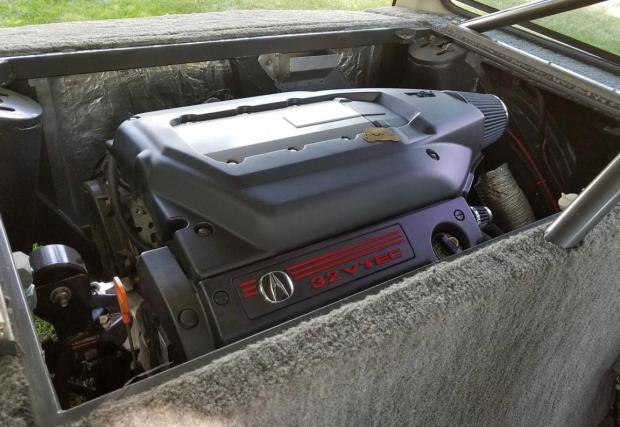 Иии малко напомня на Renault 5 Turbo, ни си е чист Civic. Или почти чист, защото двигателят, както пише в заглавието, е със сменено разположение, вече на мястото на втория ред седалки. И е изваден от Acura CL Type S – 3,2-литровия J32A2 V6, генериращ около 260 к.с. Скоростната кутия също е с произход Honda и е 6-степенна механична.
