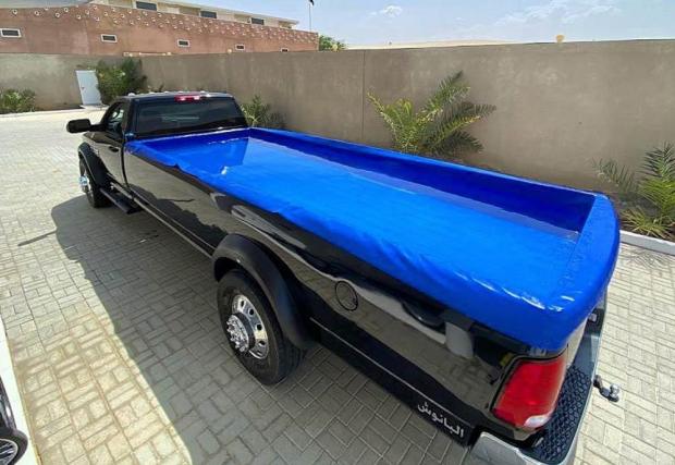 Пикапът е… гигантски. Междуосието му е 5,2 метра, което означава, че между предните и задните му гуми може да паркира S-класа. Дължината на самия леген също е абсурдна – 4,9 метра, като на една от снимките се вижда, че спокойно може да служи и за басейн.