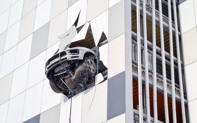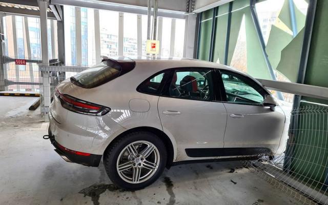 Шофьор на Porsche Macan едва не загуби живота си, след като се вряза в стената на многоетажен паркинг в Москва. Куриозният инцидент е станал на третия етаж, на 12 метра от земята, като по всяка вероятност става въпрос за шофьорска грешка. За щастие металната конструкция все пак е спряла колата, въпреки липсата на тухлена или бетонна стена.