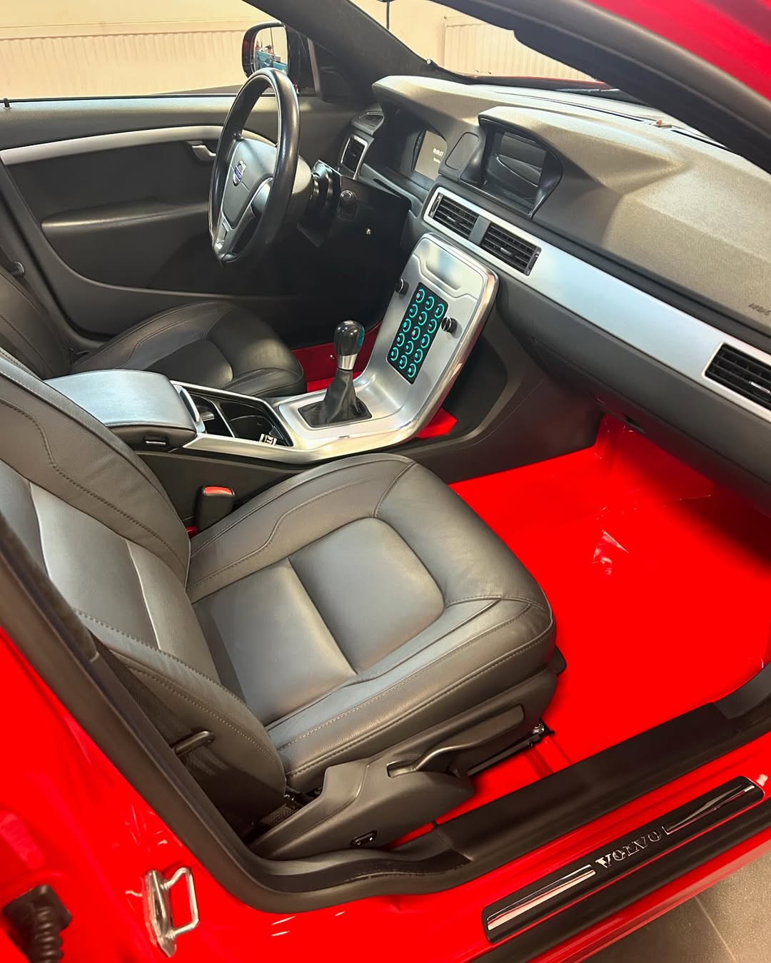 Отвътн, както виждате, изглежда почти като нормално V70, каквото далеч не е. Тоби е трансплантирал 6-цилинродв редови 2JZ-GTE от Supra, a 6-степенната ръчна кутия ZF е взел от BMW. Шведът е свалил доста части от „баварец“ и по-специално от E60 M5. С такъв произход са карданът, осите, диференциала, кормилната рейка и спирачките. Елементите на окачването също са били разработени за M5-цата, но от D2.