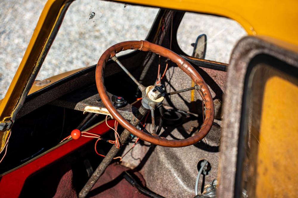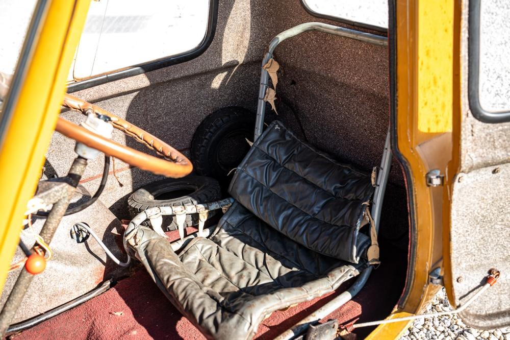 Което, освен минималистичния калибър на Peel P50, е и причина за масата от едва 59 кг. Двигателчето седи буквално в купето и е с обем 50 куб. см, мощно е 4,5 к.с. и е с произход DKW. Задна скорост няма, но пък отзад има дръжка, а напред може да се движи с малко над 60 км/ч, макар че максималната скорост зависи и от масата на шофьора. Ясно е, че динамиката не е силата на количката, за разлика от икономичността – разход от под 3 л/100 км. Опциите също не са били много, да не кажа никакви.